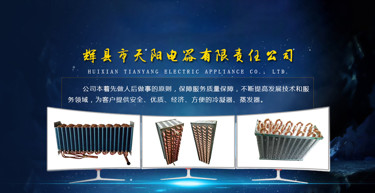 輝縣天陽電器有限責(zé)任公司位于肥沃的中原河南省輝縣市學(xué)院路中段工業(yè)集聚區(qū)興業(yè)園3號廠房,以制冷設(shè)備用冷凝器,蒸發(fā)器,熱交換器為主。主要材料為銅管鋁翅片,銅管銅翅片,鋁管鋁翅片。廣泛應(yīng)用于冰箱冰柜,制冷設(shè)備,暖通設(shè)備,空調(diào),自動售貨機,冷干機,超市立風(fēng)柜,冷藏車,烘干機等產(chǎn)品領(lǐng)域。  公司自1998年成立以來,始終堅持:“科技造就產(chǎn)業(yè)、質(zhì)量成就信譽、誠信鑄就輝煌”的質(zhì)量方針,從產(chǎn)品拓展上堅持“人無我有,人有我優(yōu),人優(yōu)我特的”經(jīng)營理念,25年來,從1998年開始供應(yīng)河南冰熊集團下屬的冷柜廠,制冰機廠各種冷凝器;2003年之后,原冰熊集團的精英志士開始在全國各地發(fā)展,所到之處依托我公司供貨,以致于多家目前已具行業(yè)中佼佼者的公司,從而建立了如凱雪公司,兆邦公司、凌云公司、海寶公司、正雪公司、上海忠云、山東德萊維等幾十余家公司在草創(chuàng)時期的啟蒙供貨商,友好共贏長達十余年,成為我國制冷行業(yè)的供應(yīng)商。以致在2015年初雙匯集團面向社會的招標(biāo)書中指名要我公司冷凝器、蒸發(fā)器指定產(chǎn)品供應(yīng)商